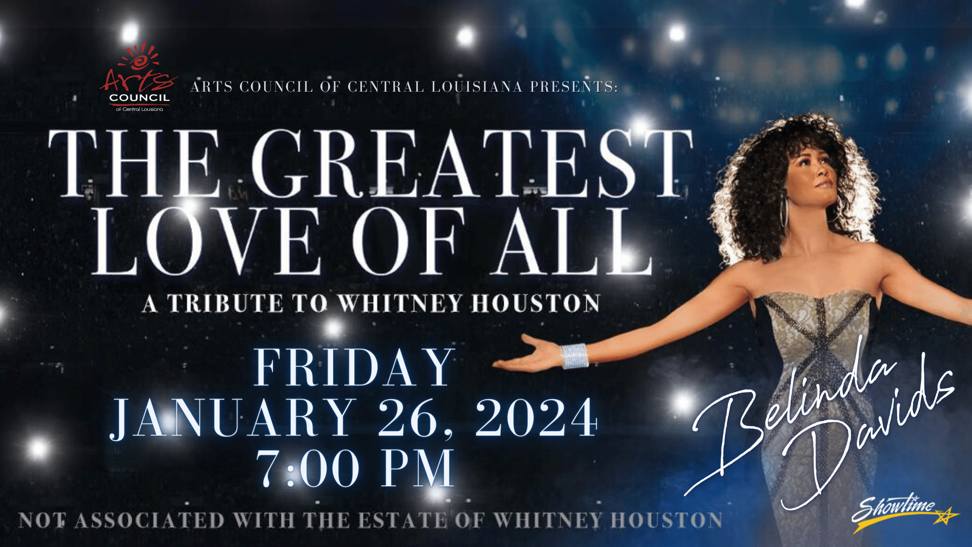 Join the Arts Council of Central Louisiana as they present: The Greatest Love of All – Whitney Houston Tribute staring Belinda Davids on Friday, January 26 at 7:00 PM in the Coughlin-Saunders Performing Arts Center.
