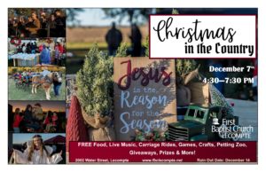 Picture a Hallmark Christmas movie outdoor festival with a whole lot of Jesus, and you have Christmas in the Country! A petting zoo, outdoor games, live music, coffee, hot chocolate, hot dogs, funnel cakes, carriage rides and much more! And it’s all at no cost! Bring your family and enjoy a simpler way of celebrating Christmas in the Country. In the instance of rain, we will reschedule to December 14.