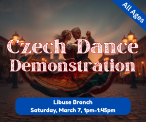 The Libuse Branch is excited to welcome the Louisiana Czech Heritage Association for a lively Czech dance demonstration! Join us on Saturday, March 7, 2026, just after our regular closing time at 1:00 PM, for this special performance. Audience participation is encouraged—so be sure to bring your dancing shoes!
