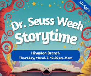 “Be awesome! Be a book nut!” Come celebrate Dr. Seuss at the Hineston branch all week long for his birthday, and have some fun!! It’s story time!!! Come and listen to a story read by a Dr. Seuss character and create a Dr. Seuss inspired craft.