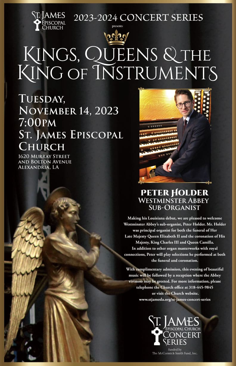 Sub-organist of London’s famed Westminster Abbey, Peter Holder, makes his Louisiana debut playing a concert of music fit for royalty on St. James’ king of instruments. Admission is complimentary with a reception immediately following the concert in the Parish Hall. Mark your calendars and bring a friend.