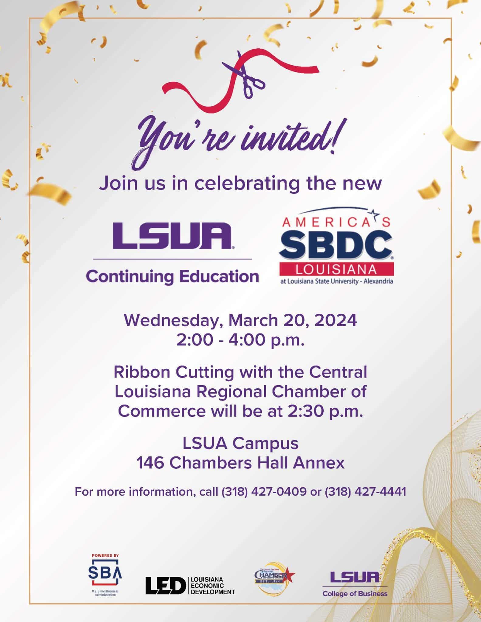 Join us in celebrating the new Louisiana Small Business Development Center at LSU of Alexandria and the LSUA Continuing Education Center on Wednesday, March 20, 2024, from 2:00 to 4:00 pm.