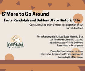 Come join us at Forts Randolph and Buhlow State Historic Site as we celebrate the catfish re-stocking of Lake Pierson. Please RSVP your group’s amount of people at fortrandolphint1@crt.la.gov or the phone number below so we can prepare.