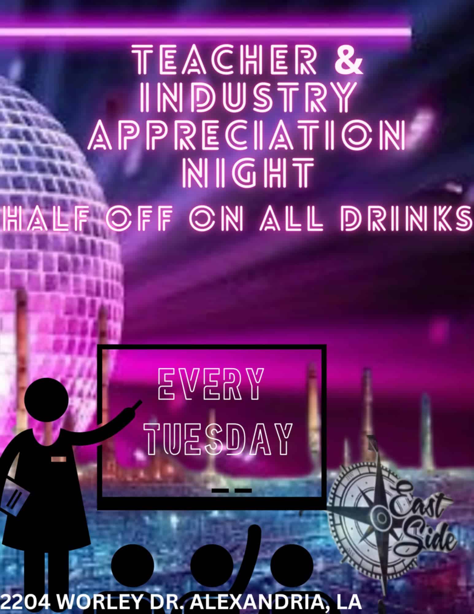 Service industry night is for those that had a long day in the restaurant or bar life and needs a calm relaxing environment. Same as teachers. Most teachers don’t get enough recognition for there efforts in making our youth better. They deserve a day and more. Drink specials all day.