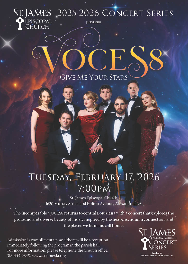 Making their only Louisiana stop on this US tour, the incomparable British choral ensemble, VOCES8, returns to perform as part of the 2025-2026 St. James Episcopal Church Concert Series. The concert will explore the profound and diverse beauty of music inspired by the heavens, human connection, and the places we call home.