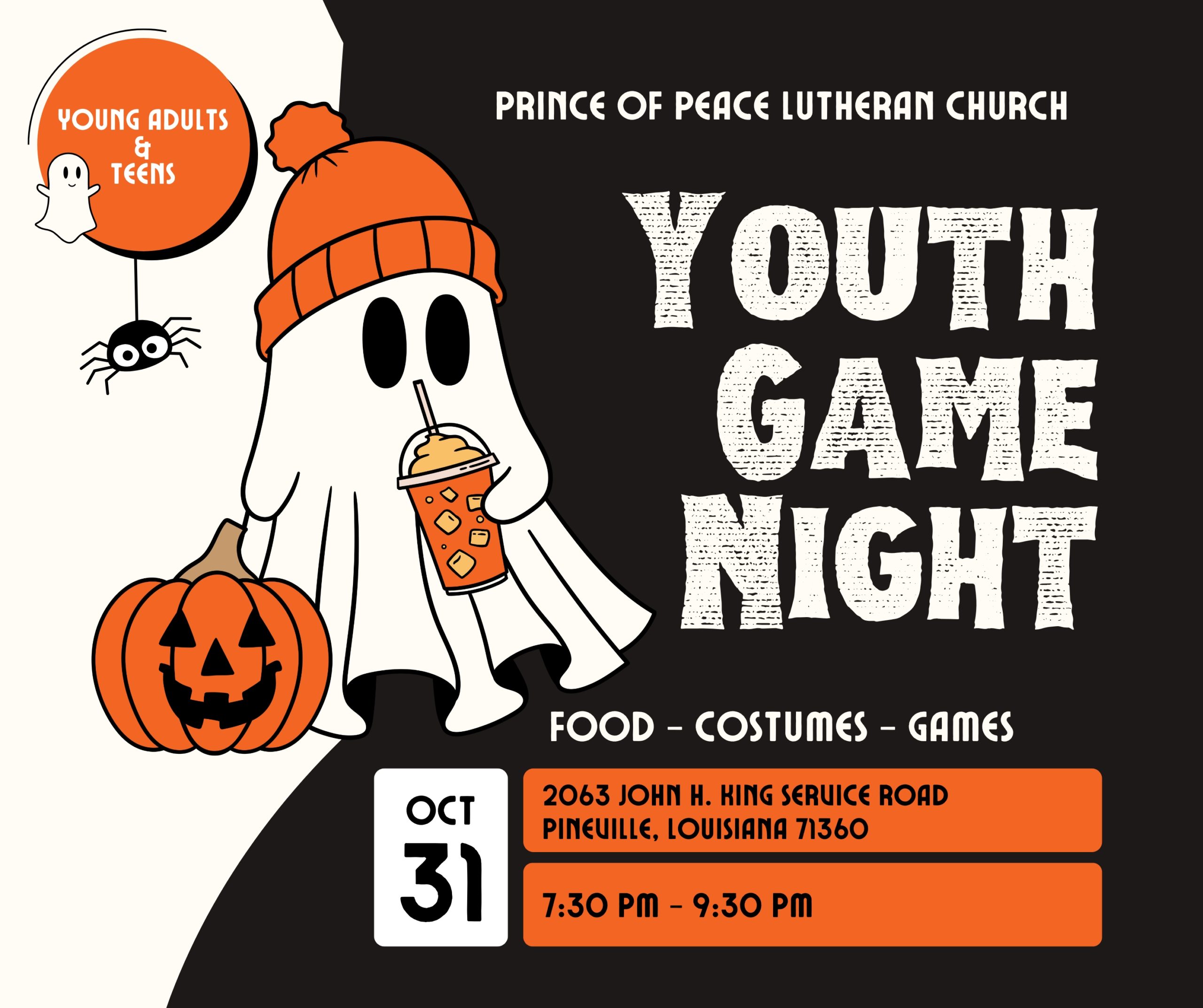 Prince of Peace Lutheran Church Presents Young Adult Game Night! Come hang out, have some food, and play games in our fellowship hall. Don’t forget to wear your Halloween Costume for some spooky fun and fellowship!
